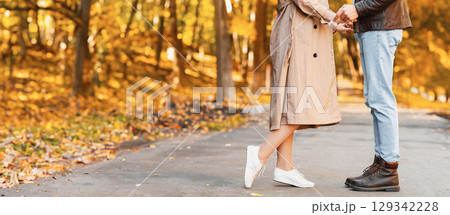 Male hand in gloves collects, piles fallen autumn leaves at sunset. Volunteering, cleaning concept.