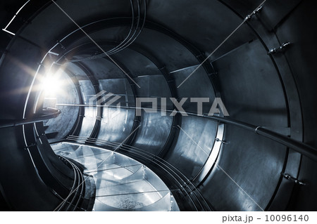 Abstract underground industrial sewerage. Dark blue metal tunnel