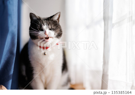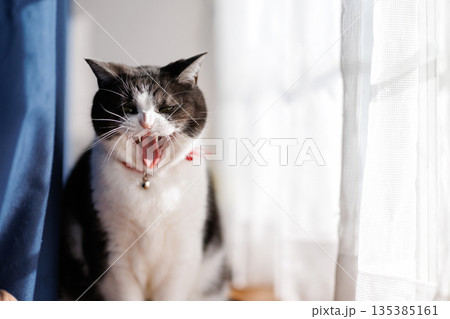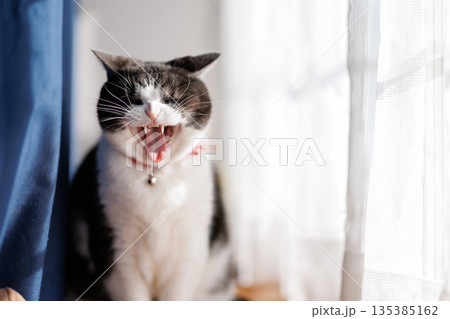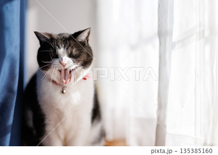 ベッドでひなたぼっこしてあくびするキジトラ白の猫