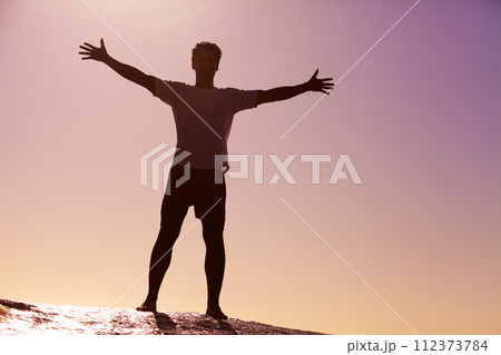 Man, horizon and freedom in sky with hiking in nature for adventure and fitness, mockup space and travel. View with trekking, journey and hiker outdoor with sunset color and exercise on mountain