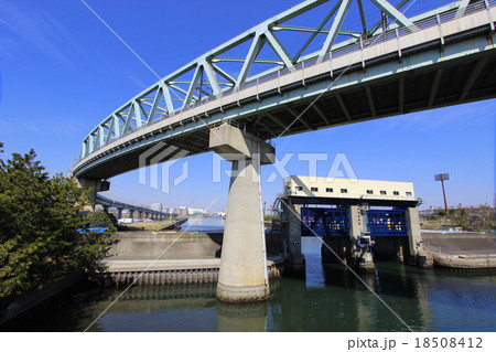 鉄道橋と水門 JR 夢の島橋梁・曙水門・国道357号 b 広角