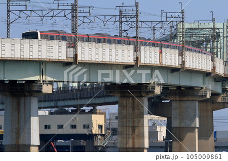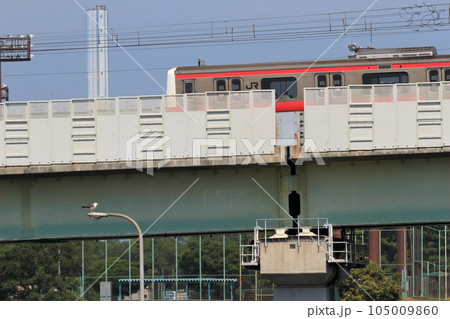 東京の水辺と鉄道橋 JR砂町運河橋梁とビル越しの東京スカイツリー 中望遠