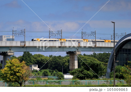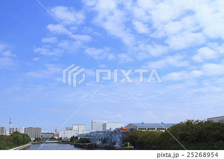 東京の水辺と鉄道橋 JR砂町運河橋梁とビル越しの東京スカイツリー 広角 空と橋