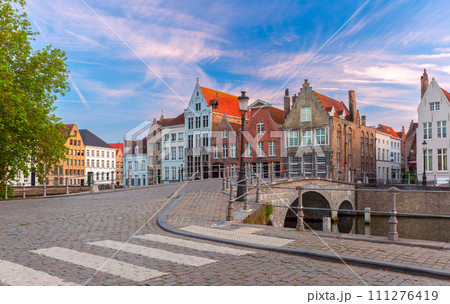 Amsterdam Downtown. Beautiful sky at sunrise, old houses, canals and bridges. Calm reflections in the water. Heart of Amsterdam.