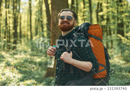 Bottle of water, holding. Bearded man is in the forest at daytime