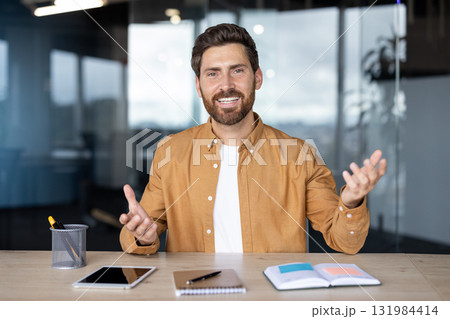Smiling man with a beard making a video call, communicating and gesturing while sitting at a desk in a modern office, presenting or discussing with colleagues online