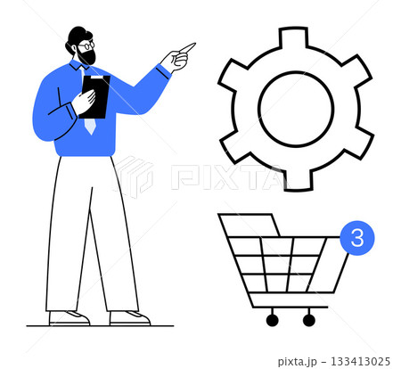 Bearded man with clipboard pointing at a cogwheel and shopping cart symbol with notification. Ideal for business planning, project management, online shopping, e-commerce, customer service, process