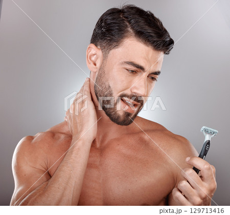 Razor, beauty or man in studio to shave beard in grooming marketing razor hair care products. Self care, studio background or healthy male model shaving for good skincare in morning routine treatment