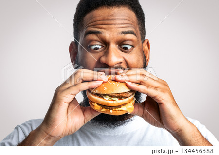 Funny Hungry African Guy Eating Burger Standing On White Studio Background. Black Man Enjoying Hamburger Overeating Junk Food. Nutrition And Unhealthy Fastfood, Binge Eating Habit Problem Concept