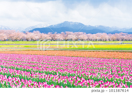 チュウリップ畑と桜並木に北アルプス