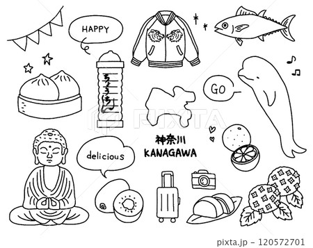 秋の鎌倉の観光地の街並みのシンプル線画セット