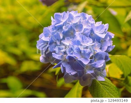 青紫のあじさいが咲き誇る庭園の小径、やわらかな光に包まれる季節の風景