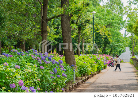紫陽花が咲き乱れる初夏の広場