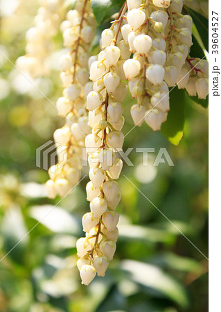 早春の花・濃緑の葉に純白のアシビの花房・横位置