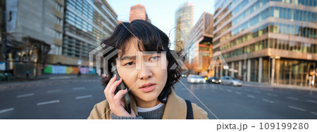 Portrait of young korean woman walking down street with phone, talking with someone, makes a call, has telephone conversation
