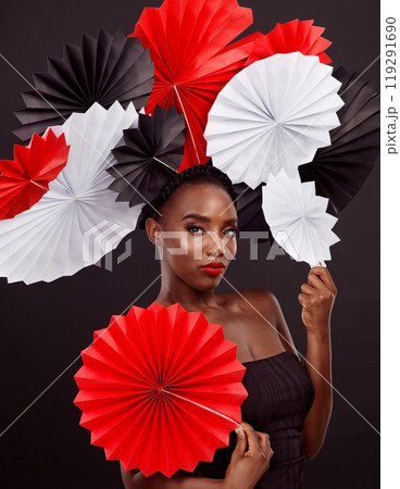 Origami fans, black woman and portrait in studio for beauty with makeup isolated on dark background. Cosmetics, pride and oriental paper art for culture with tradition, confidence and skincare.