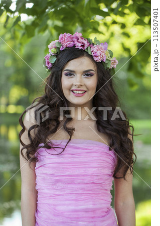 Beautiful summer woman with long dark wavy hair, clean shiny skin and pink flower crown