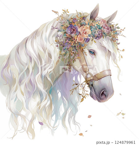 Majestic white horse adorned with floral crown in a serene pastel setting