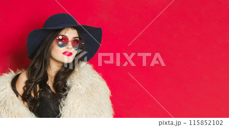 Sensuality young adult woman fashion model with bright make-up and long wavy hair wearing blue hat