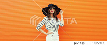 Portrait of beautiful young woman posing in white striped shirt, black hat on orange background