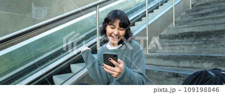 Headshot of smiling korean woman with smartphone, makes a phone call, goes down escalator in city, commutes to university
