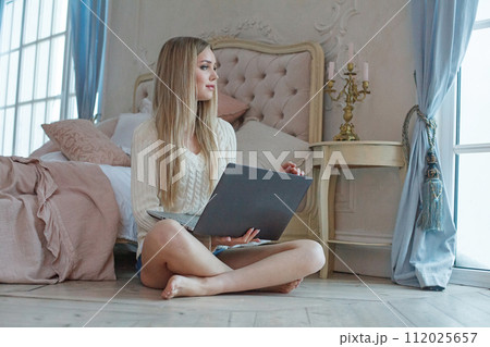 Portrait of pretty young adult woman with long healthy blonde hair sitting on wooden floor