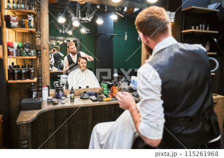 Hairdresser making final touches in new haircut. Comfortable atmosphere in modern barbershop.