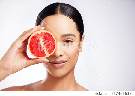 Portrait, grapefruit and woman with glow in studio for skincare, wellness and nutrition. Model girl, face and vitamin c for vegan and organic products for health and detox by white background