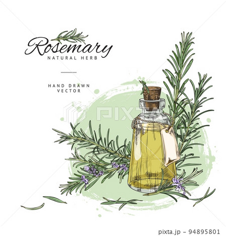 Rosemary plant and oil bottle, poster template with copy space for text, sketch vector illustration.