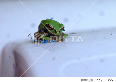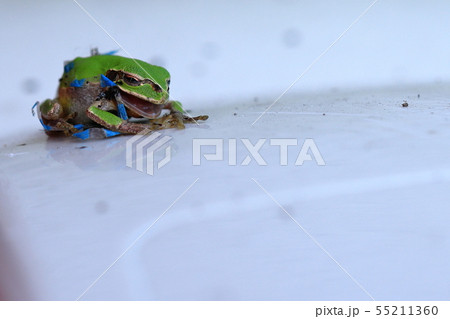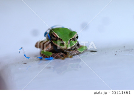 自動販売機の横のゴミ箱の上に居たアマガエル