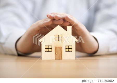Wooden toy house protected by hands. Home insurance concept
