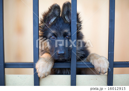 Unhappy puppy behind bars in shelter