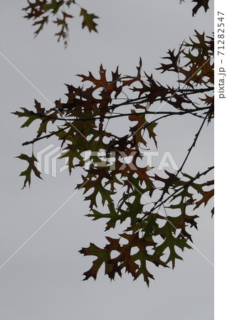 葉の形がユニークなピンオーク(アメリカガシワ)の紅葉 逆光で形を強調して撮影