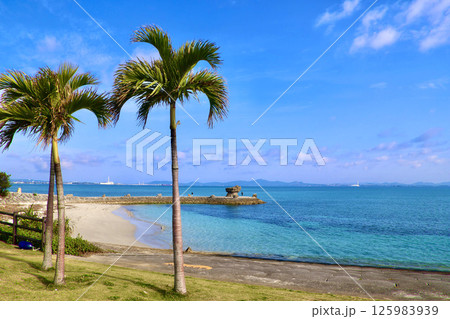 【沖縄県】快晴の海中道路ビーチとヤシの木