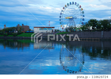あらかわ遊園の観覧車と水面に映える景観 夕景