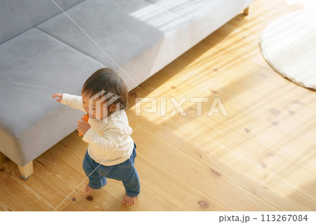 ソファの周りを歩く小さな女の子