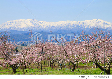 南原堤の桜と飯豊山(福島県・喜多方市)
