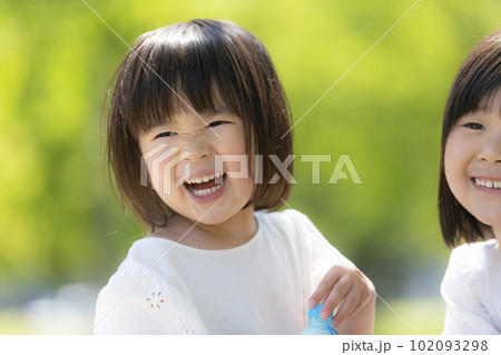 新緑の初夏の公園で遊ぶ小さな姉妹