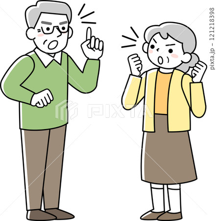 (複数)怒って指さして怒鳴る女性と怒りで対抗して言い合う高齢の男性