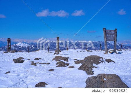冬の長野県 車山山頂標識と北側の眺望(三峰山,王ヶ鼻,美ヶ原など)