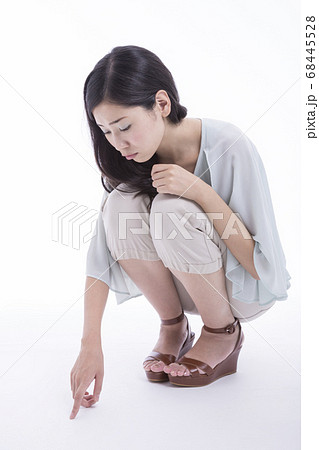 つまらなそうに地面をいじっている私服の若い女性(全身)