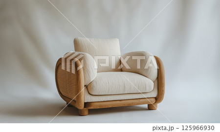 Modern armchair with wooden frame and cream fabric cushions offers cozy and stylish seating for living room or lounge area with soft texture