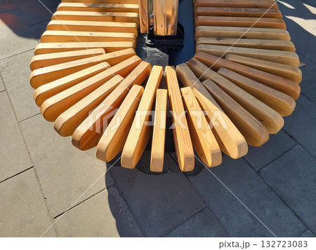 A semi-circular wooden light brown curved bench in a park on a bright sunny day.