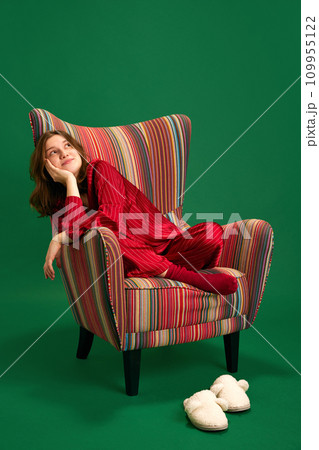 Full length young beautiful girl siting retro chair and dreams of being given gifts from her wish list against green studio background.