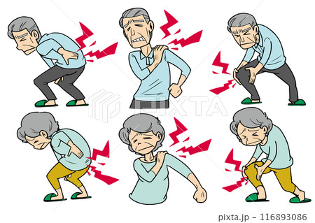 シニアの肩こり・腰痛・膝の痛みイラスト_男女セット