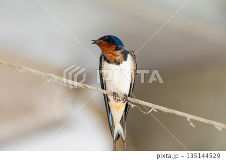 ロープに止まり周囲を警戒するツバメ