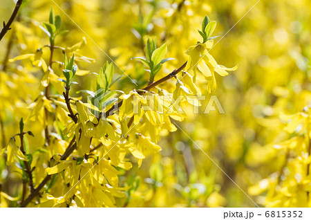 早春の花の背景素材・鮮やかな黄色の花を付けて花枝を伸ばすレンギョウ・横位置