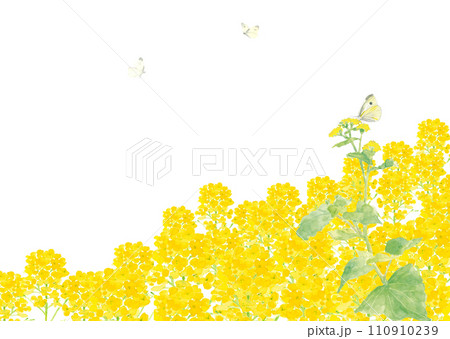 水彩で描いた菜の花畑と蝶の手描きイラスト 白バック コピースペースあり