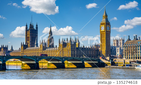Houses of Parliament and Big Ben rise majestically against a clear blue sky. The River Thames flows calmly beneath Westminster Bridge as a red bus crosses, showcasing London vibrant atmosphere.