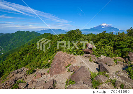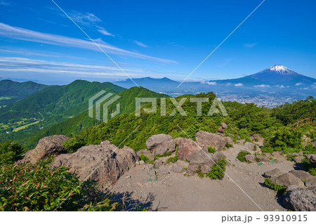 金時山の山頂下から火山岩越しに西側の富士山方面眺望